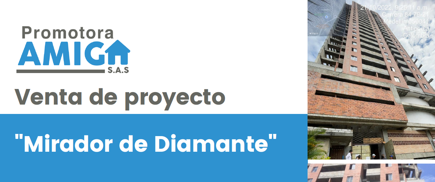 Mirador del Diamante es una obra de construcción de unidades de vivienda con un avance del 70%, ubicada estratégicamente en el barrio Robledo de la ciudad de Medellín, y hace parte de los activos de la sociedad en liquidación, por lo tanto, se encuentra inmerso en el proceso de liquidación forzosa administrativa. Mediante la Resolución No. 002 del 17 de enero de 2024, la Liquidadora de la sociedad Promotora Amiga S.A.S. da apertura al procedimiento de venta urgente por caso de urgencia por la situación de iliquidez con el fin de atender los gastos administrativos de la sociedad PROMOTORA AMIGA S.A.S. EN LIQUIDACIÓN FORZOSA ADMINISTRATIVA .